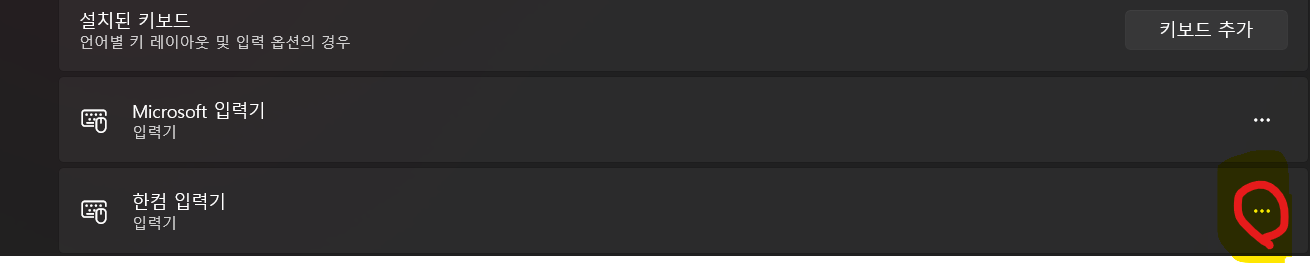 4. 그러면 맨 밑에서 한컴 입력키의 메뉴 버튼을 눌러 제거하면 된다