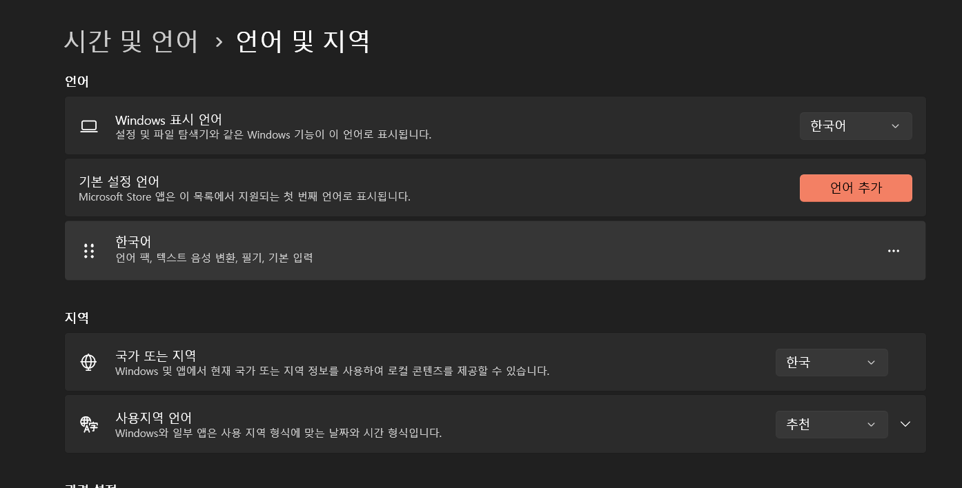 2. 설정에서 '시간 및 언어' > '언어 및 지역'을 클릭해 들어온다
