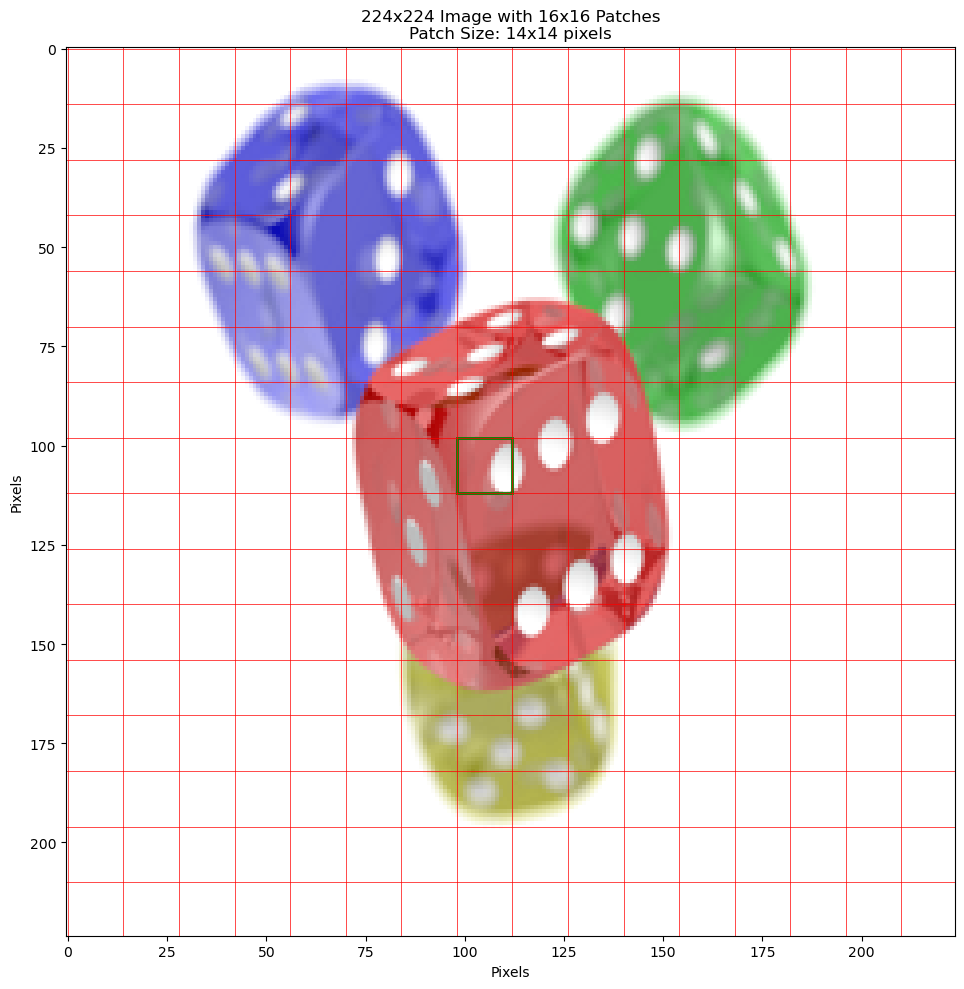 ax.set_title(f'{img_size}x{img_size} Image with {num_patches}x{num_patches} Patches\nPatch Size: {patch_size}x{patch_size} pixels')